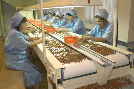 Behind the Gilan Hotel (on the southern edge of Qabala) is a nut processing factory. The roads in this area, particularly noticeably on the onward journey to Sheki, are lined with hazel orchards. In season young children wait at the roadside for passers by, and enthusiastically try to sell you an armud (tea glass) full of delicious, freshly shelled hazelnuts. Local people simply turn up to the factory with their sacks of nuts. Staff use a shiny brass corer to take a cylindrical sample of nuts from the sack and the nuts are then checked for quality before payment is given.