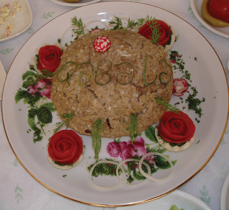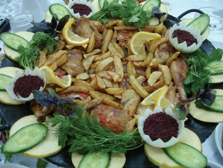 This time the rim of the skillet was decorated with thin round apple slices topped with obliquely cut cucumber slices. Fresh herbs, (dill, coriander and purple basil) decorated the edge, interspersed with decoratively cut and hollowed half onions containing ´sumach´ - a popular and colourful condiment in Azerbaijan - which comes from the sumach tree. In the centre, chicken pieces, cooked with tomatoes and onions, were mixed with freshly cooked hand-cut potato chips, and decorated with twisted, fresh lemon slices, and all kept warm over the hot charcoal beneath the skillet. Imagine the combination of colours, smell and flavours.