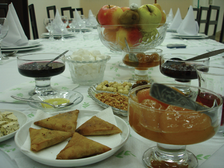 Of course in Qabala we were served the very best sort of tea - samovar tea. The water is heated in a large metal container, a bit like a tea urn, called a samovar. A samovar has a central core which contains the heat source for the water. Burning wood generally provides the heat. Although the water doesn´t actually come into contact with the wood, the aroma seems to, so this water makes delicious tea. The tea itself is made strong, with the teapot being placed on top of the samovar to keep warm. A little tea is poured into the armud (pear-shaped glass) and topped up to the required strength with the water from the samovar - there is a little tap on the front of the samovar. This is quite a ritual, and is never hurried, so samovar tea can take a long time in the preparation. Sometimes a herb called Uzerlik is added to smoking charcoal, and this adds a different aromatic element to the room and also reputedly keeps away the ´evil eye´.