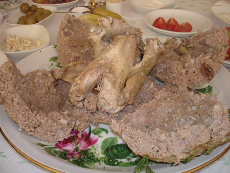 The Big Secret, another Qabala Hotel treat, turned out to be a massive meat ball. Its official name is Arzuman Kuftesi (Arzuman´s kufte). First I tasted it (good) and then it was properly cut open, and there was a whole cooked chicken inside. And wait. Inside the chicken was a whole boiled egg. By this time I was feasted out.