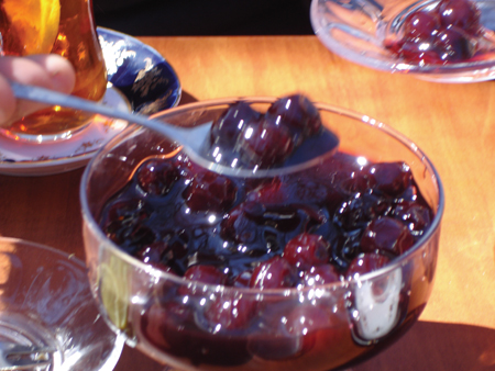 Simple and predictable, and comprising bread with butter, and local cheeses and local honey, breakfast is served with as much tea as you want to drink. At this time of day tea is served in crystal tumblers (add your own sugar cubes to achieve the required degree of sweetness).